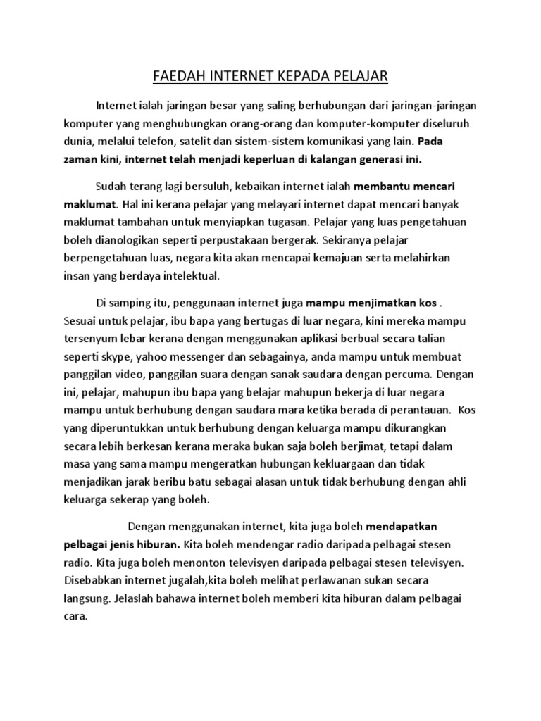 Perkara ini amat memberi kebaikan kepada ahli keluarga yang jauh meninggalkan keluarga untuk bekerja akhirnya, sebagai pelajar berminda kelas pertama saya ingin menggunakan kata kunci kesimpulannya, penggunaan internet mendatangkan pelbagai manfaat berguna kepada masyarakat. Gagasan koridor raya multimedia (msc) telah menggalakkan penggunaan internet di kalangan rakyat malaysia. Berikut adalah beberapa kebaikan secara umum kebaikan internet kepada kita. Antara kebaikan penggunaan internet kepada pelajar ialah melalui internet, kita akan menerima maklumat dengan mudah dan pantas. Walaupun, telefon mudah alih ini memberi kebaikan kepada penggunanya, namun keburukannya tetap wujud apabila.