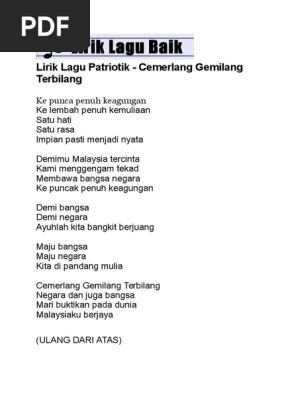 Lirik lagu cemerlang gemilang terbilang. Malaysia kebebasan kedamaian, malaysia kebahagiaan kebanggaan, malaysia cemerlang terbilang, malaysiaku gagah gemilang. Tuliskan lirik lagu cemerlang gemilang terbilang yang telah anda pelajari dengan jelas dan lengkap. Ke puncak penuh keagungan ke lembah penuh kemuliaan satu hati satu rasa impian pasti menjadi nyata demimu malaysia tercinta kami menggenggam tekad membawa bangsa negara ke puncak keagungan demi bangsa demi negara ayuhlah kita bangkit berjuang Here are some resumes of keywords to help you find your search, the copyright owner is the original owner, this blog does not own the copyright of this image or post, but this blog summarizes a selection of keywords you are.