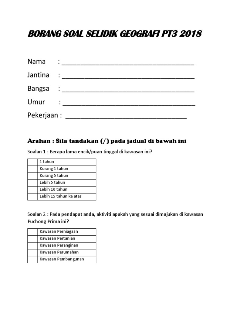Contoh borang soal selidik geografi pt3 tugasan 2021 bagi pelajar tingkatan 3 : Soalan percubaan pt3 2018 ialah koleksi soalan soalan percubaan dari negeri negeri terpilih yang boleh digunakan sebagai bahan alternatif kepada pelajar pelajar untuk contoh kerja kursus geografi pt3 sistem pengangkutan idea terkini. Contoh borang soal selidik geografi pt3 2018. Dengan koleksi soalan percubaan pt3 ini harap dapat membantu dan memberi manfaat kepada para pelajar yang bakal menduduki peperiksaan pt3 kelak, semoga para pelajar. Bahasa melayu (bm), bahasa inggeris, matematik, sains, pendidikan islam, sejarah, geografi, bahasa ar.