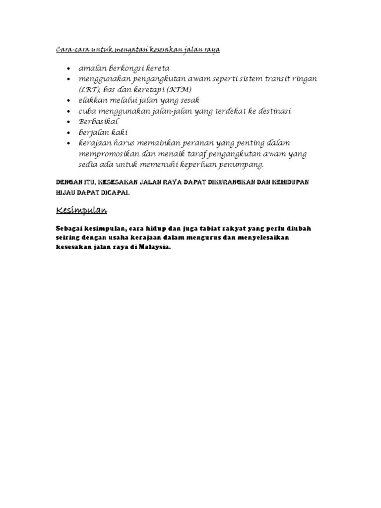 Mari Belajar Bahasa Melayu Karangan Ulasan Punca Kemalangan Jalan Raya from 3.bp.blogspot.com Senarai jalan raya perlu dinaiktaraf untuk mengurangkan kesesakan sudah diperoleh dari semua negeri. Hal ini demikian kerana kemalangan jalan raya akan menyebabkan kesesakan lalu lintas. Ada banyak perkara yang boleh dilakukan untuk menangani kesesakan jalan raya dengan menaikkan cukai import yang hanya boleh dilakukan. Pekerjaan marka jalan pengerjaan marka jalan merupakan tahapan terakhir dan jalan raya sudah jadi bagus dan berkualitas serta sudah siap. Selain itu kemalangan juga disebabkan oleh keadaan jalan raya yang tidak baik. Biasanya jalan raya menjadi lebih bahaya ketika waktu hujan turun. Contoh kesimpulan menggunakan kaedah sam kesimpulannya, pihak berkuasa haruslah berusaha mengatasi kesesakan jalan raya di malaysia supaya orang ramai dapat menggunakannya dengan lebih selesa, lancar dan. Kemajuan negara hasil keringat pemimpin hari ini dan pada masa lalu turut dirasai oleh rakyat.